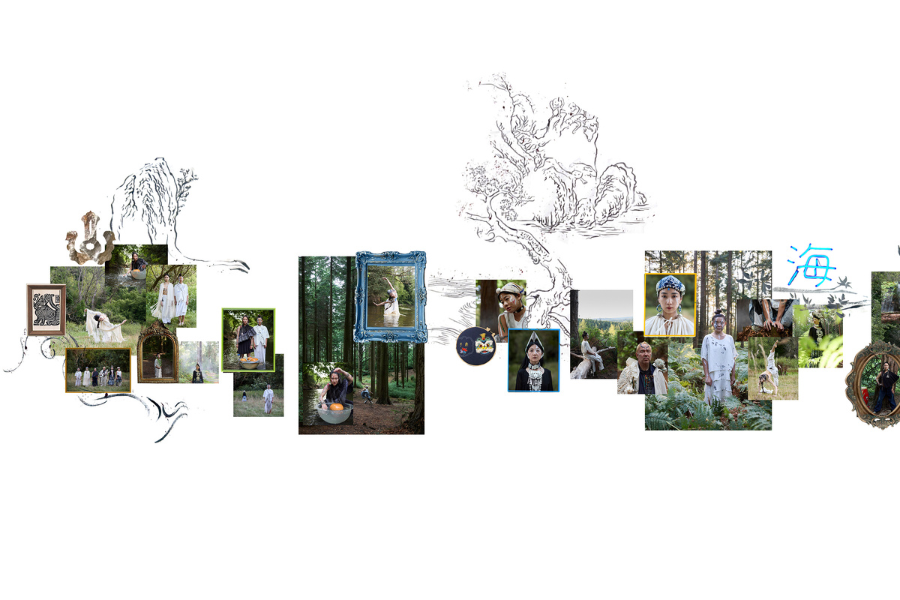 Breaking away from conventional hanging systems, artist Xie Rong will paint directly onto the wall, creating an organic flow of mountains, trees, and water — echoing the visual and emotional landscape of the performance. Her painting will weave around a series of striking portraits of the performers, photographed in the Surrey Hills by renowned photographer Jamie Baker, capturing the essence of myth and nature intertwined.